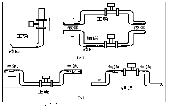 5. 測量氣體時,在垂直管道安裝儀表,氣體流向不限。但若管道內含少量液體,為了防止液體進入儀表測量管,氣流應自下而上流動,如圖(四)a所示